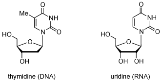 图7 | 尿嘧啶和胸腺嘧啶核苷结构尿苷的RNA发生; 胸苷的DNA。